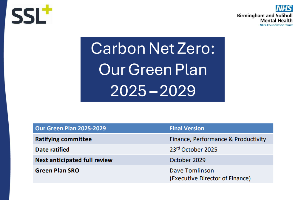 The Birmingham and Solihull Mental Health Foundation Trust (BSMHFT) Green Plan sets out a clear and ambitious roadmap towards achieving Carbon Net Zero across all areas of the Trust’s work. Owned and led by BSMHFT, the Green Plan represents a commitment to embedding sustainability into every aspect of healthcare delivery, estate management, and organisational culture. As a wholly owned subsidiary, SSL fully supports the Trust’s vision and is proud to contribute to the delivery of this important plan. The Green Plan is a vital step in addressing the climate emergency and ensuring a healthier, more sustainable future for the communities BSMHFT serves.